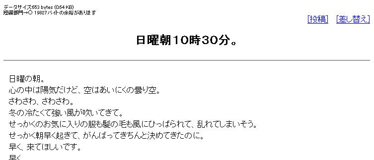 当企画では、結果発表までの投票受付期間中は、全てのSSの作者名を非公開で扱います。 サイトや掲示板などで、自分が書いたSSがどれか、あるいはそれを推測させる発言(メインキャラなど)はしないで下さい。 違反が判明した場合は、公開中止と結果からの除外を行います。 この企画に参加している事、参加部門(短編、中編、超短編)は明言されても構いません。 SSの長さについて『20KBぎりぎりだった』『40KBでも足りなくて削った』等の発言も特定をしやすくする要因となりますので控えてください。 投稿SSの自サイト等への公開は、結果発表後にして下さい。 結果発表後の掲載は自由です。管理人に許可をとる必要はありません |